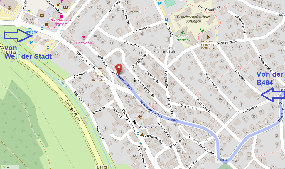 an der Maichinger Straße oberhalb der Kirche, zum Probenraum gehts den